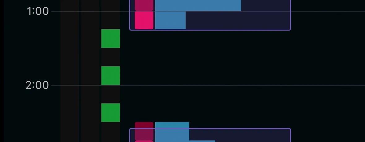 A sleep tracking app showing a period of wakefulness between 1:30 and 2:30am.The sleep tracking app showing that the reason for the period of wakefulness was ‘you were moving’.The sleep tracking app showing the environmental noise at the time was as loud as ‘a conversation’.
