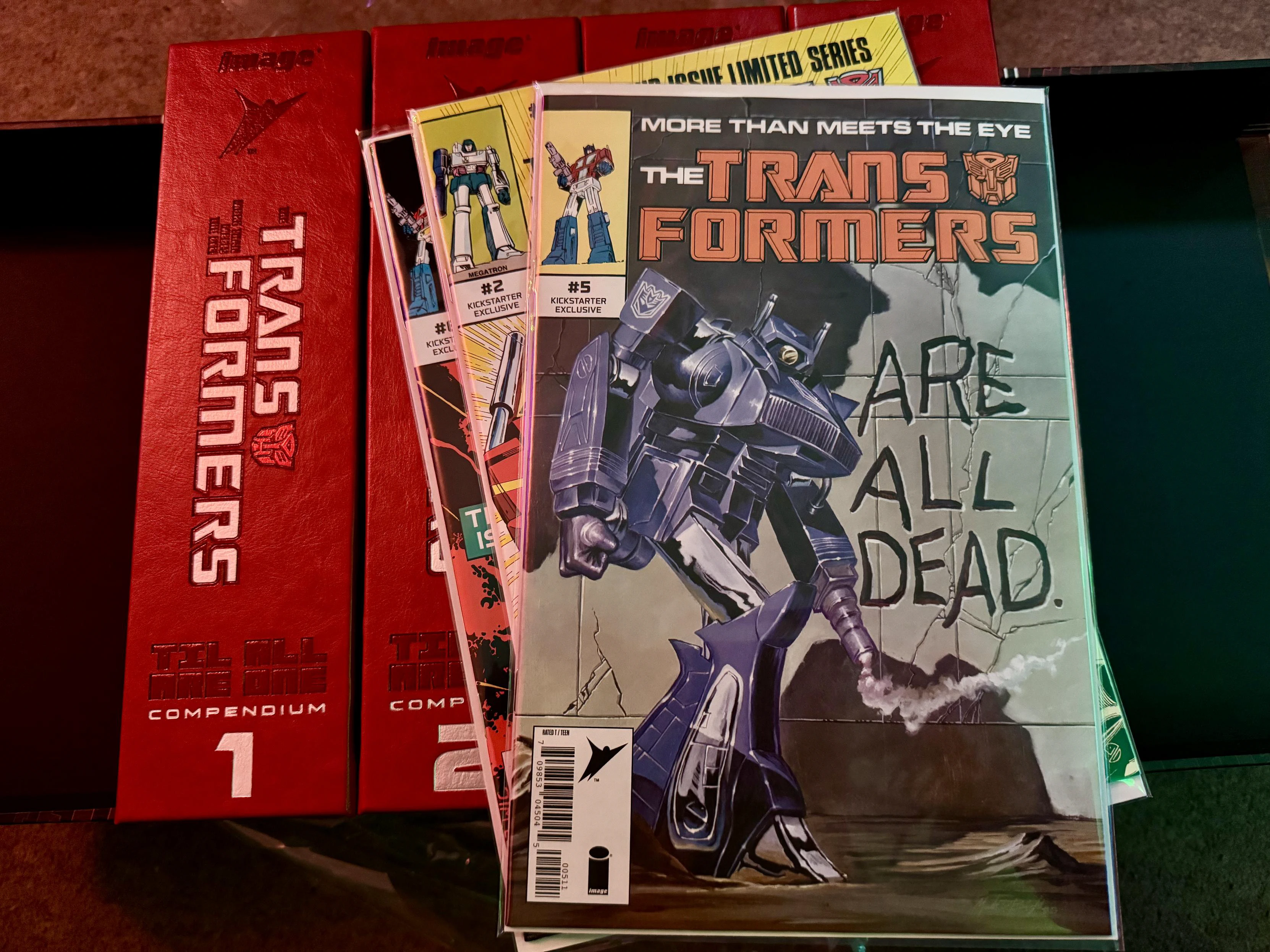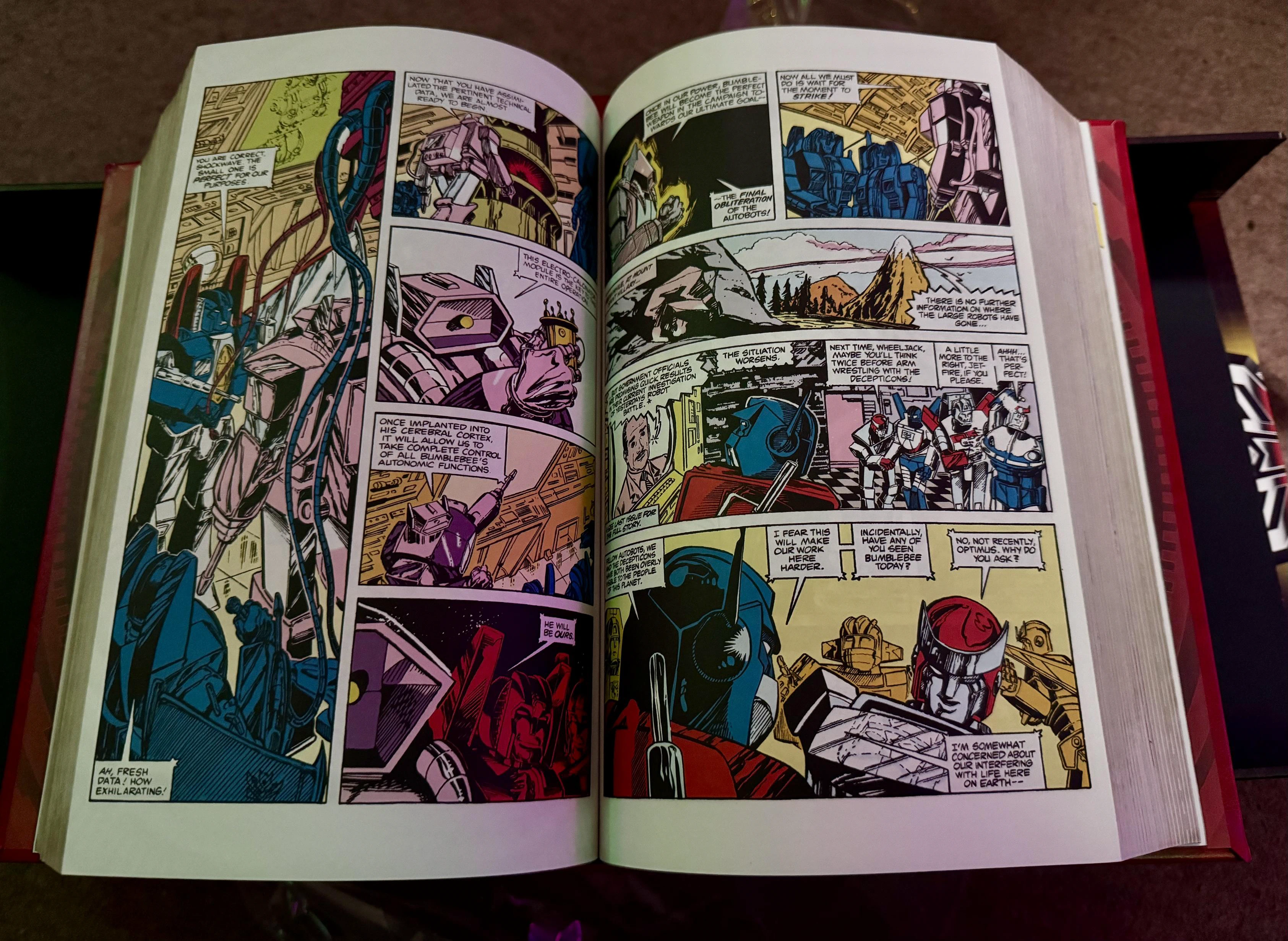 Four absurdly massive hardback compendium volumes of the eighties Transformer comic run, across Marvel US and Marvel UK, with three Kickstarter-exclusive individual comic reprints (sleeved).Compendium volume 1 opened to a random page with poor old Bumblebee apparently in the hands of Shockwave, who is clearly up to his old tricks again.A shot showing the embossed all-red-with-white-text cover of the hardcover, volume 1 sitting on top of volumes 2-4. This is the ‘Autobot’ edition, because I am a good boy.