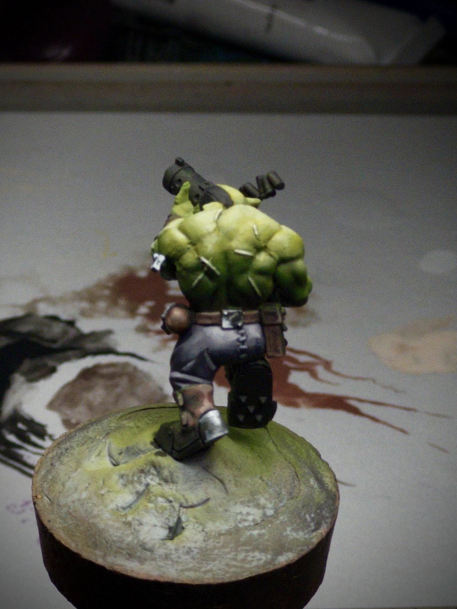 Most of the remaining primed areas on the rear of the mini now have at least a base colour applied. It’s mainly browns for belt and boots, with a few small initial NMM attempts, including a shiny heel plate. The visible patches of metal cranium and gun barrel have been blacked out in preparation.