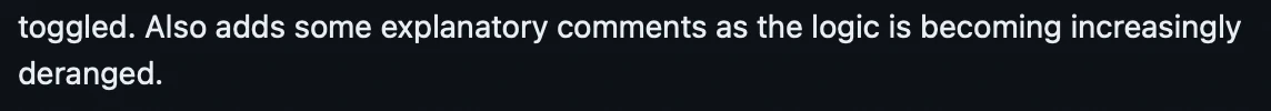 Technically I wrote said logic, but still.A fragment of a Pull Request description stating ‘adds some explanatory comments as the logic is becoming increasingly deranged’.11:17 am, August 16, 2024#Micro #DevLifeMastodon 1 1 Replies 1 1 Boosts 3 3 Favorites